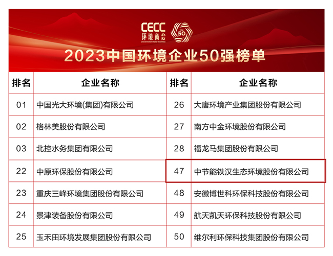 全国工商联环境商会相关负责人表示,为凸显领军企业的示范和引导作用,促进产业发展和企业成长,环境商会自2018年起,每年发布“中国环境企业50强榜单”。50强企业是我国环境产业领军力量,对产业发展发挥着重要引领作用。