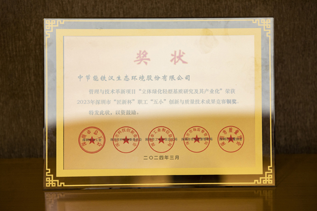 4月12日,由深圳市质量协会主办的质量创新促企业高质量发展大会在深圳市南山区举行,并为2023年深圳市“匠新杯”职工“五小”创新与质量技术成果竞赛获奖单位颁奖。星空体育管理与技术革新项目“立体绿化轻型基质研究及其产业化”荣获该项赛事铜奖。
