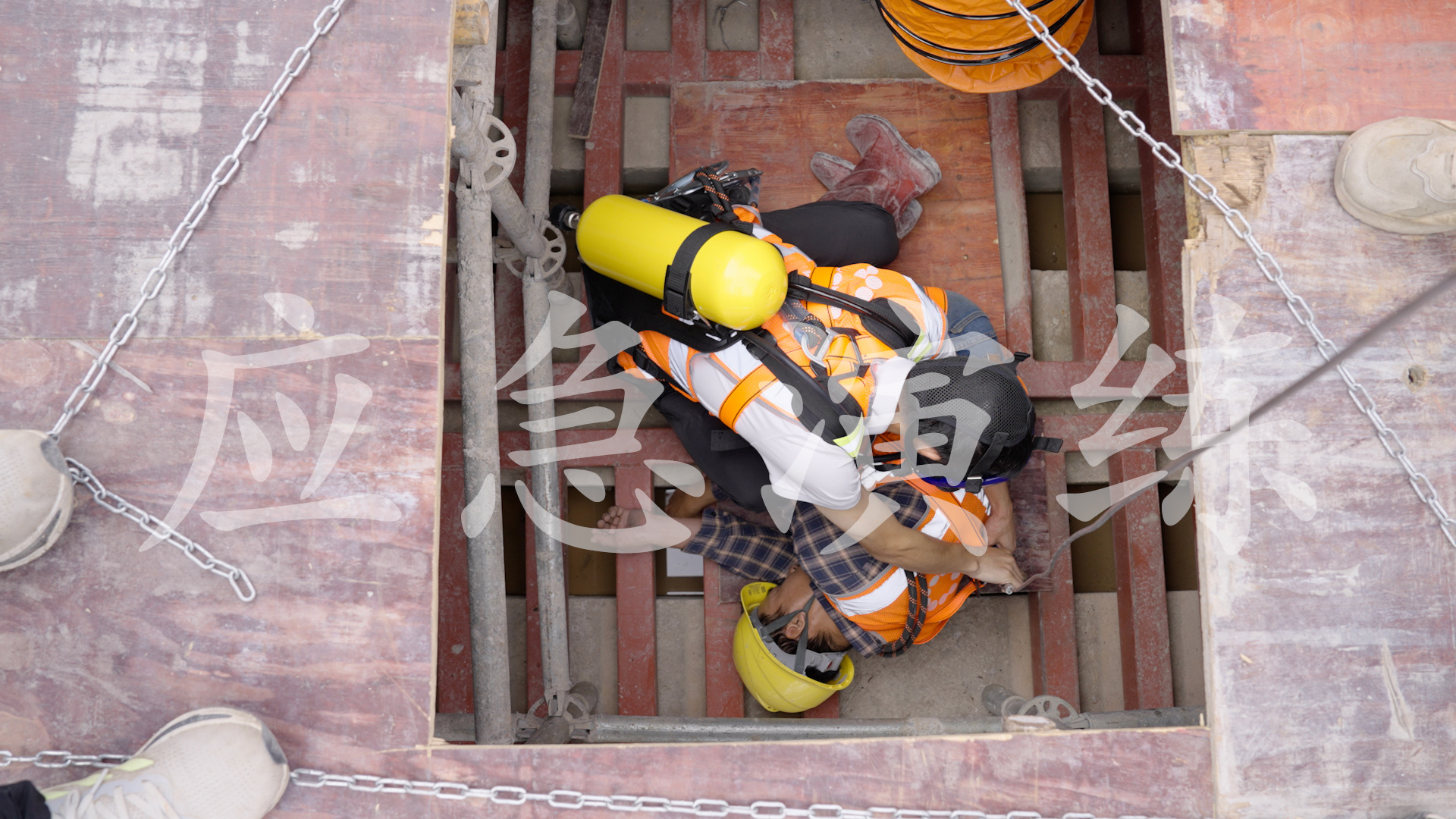 有限空间应急演练环节,模拟施工现场作业人员在消防水池内发生气体中毒窒息事故,现场管理人员立即报告给现场安全员,现场安全员到达现场后,发现中毒者无意识、无脉搏、无呼吸,立即上报项目经理开展应急救援,通过各小组的紧密协作,成功营救中毒窒息人员,使其脱离生命危险。