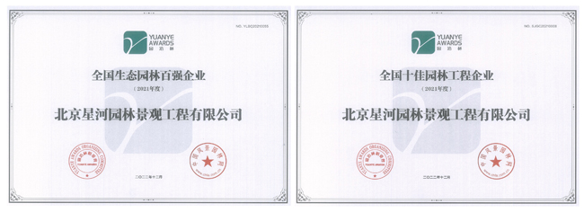 近日,星空体育所属铁汉星河(前身为北京星河园林景观工程有限公司,2023年2月更名为星空体育星河(北京)生态环境有限公司)获得由中国风景园林网、园冶杯组委会颁发的“全国生态园林百强企业”“全国十佳园林工程企业”两项殊荣。
