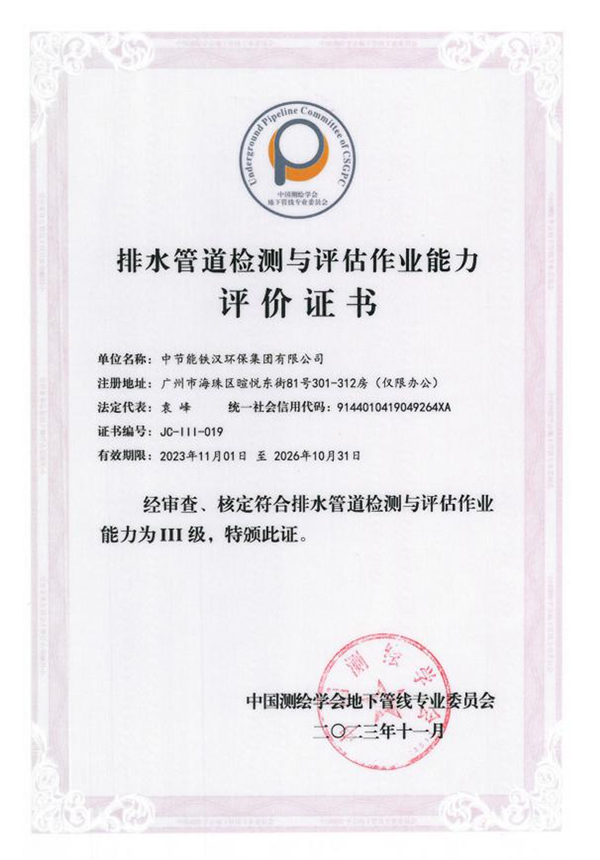 能力提升年 | 铁汉环保荣获排水管道检测与评估作业能力评价证书