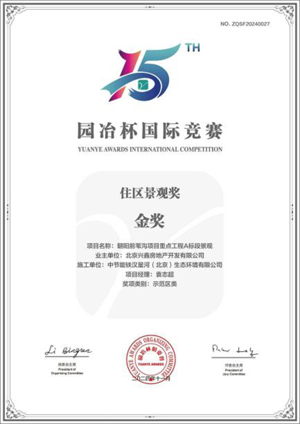 近日,第十五届园冶杯国际竞赛评审结果出炉,星空体育所属铁汉星河承建的朝阳前苇沟项目重点工程A标段景观项目(中建璞园示范区)获得住区景观奖示范区类金奖。